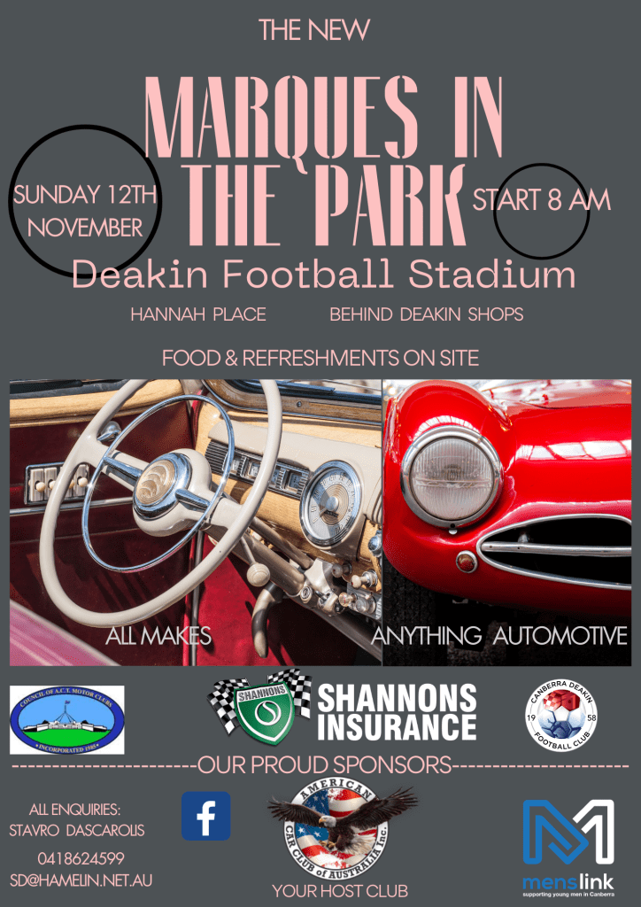 Marques in the Park was Canberra’s spring time motoring display run by the American Car Club in conjunction with the Council of ACT Motor Clubs. After its inception in 2003, the event has grown from 200 to nearly 500 vehicles.
